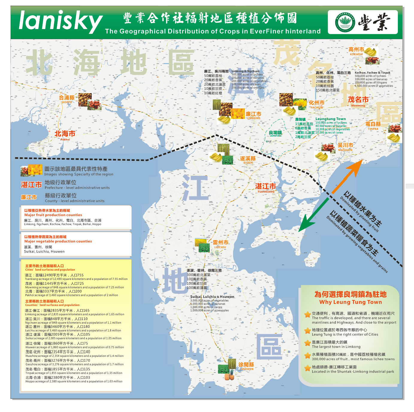 廉江市丰业种植专业合作社的辐射地区为中国大陆最主要的热带种植作物生产地,涵盖了湛江(廉江、吴川、遂溪、雷州、徐闻)、茂名(高州、化州、电白、信宜)等粤西地区县市,主要的特点是以热带水果蔬菜为主、平原与丘陵并存、农作物种植面积大且产量大、作物一年三四熟且生产周期短,在种植生产过程中拥有着无可比拟的天然优势。本区拥有入口约1800万人(其中农业人口占多数),面积27000多平方公里。种植面积大,其中荔枝155万亩,香蕉350万亩,北运菜500多万亩,在产量方面得到市场化和国际化发展的基本保证!