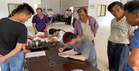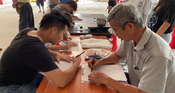 除了理论上的探讨,团队成员还特意组织了简单的蜡染培训活动,指导农户们亲自体验完成蜡染创作。蜡染创作的过程,深化了农户们对蜡染这一非遗文化的印象,对助力其与荔枝产业的结合提供了更多可能。