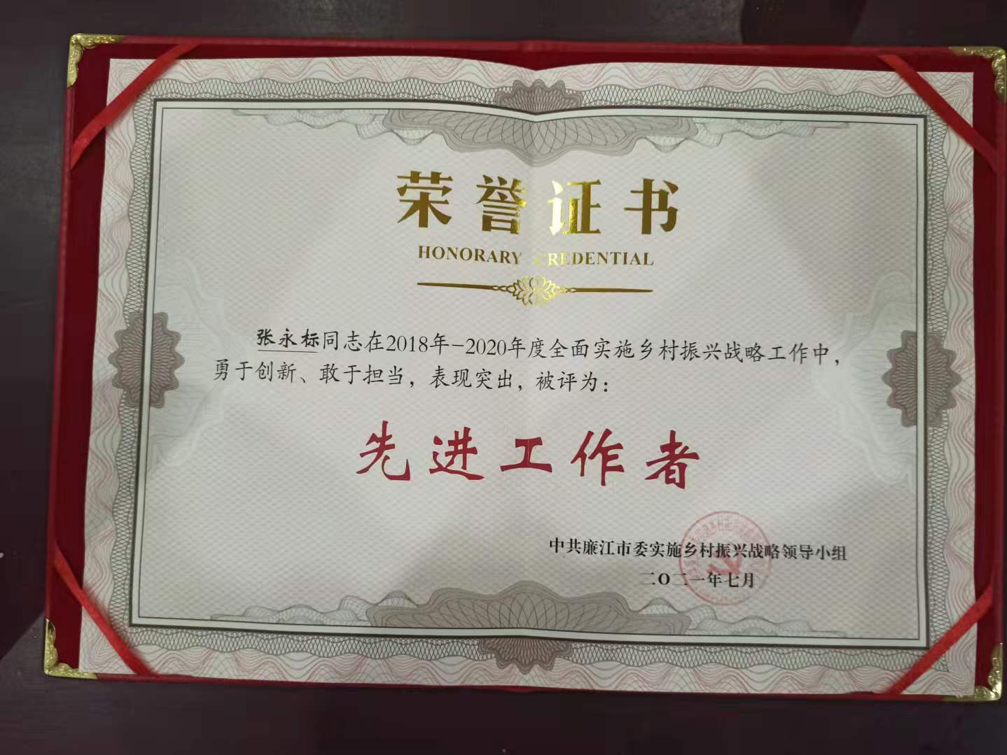 我社理事长张永标被廉江市委评为「乡村振兴战略先进工作者」。 证书中表示:张永标同志...